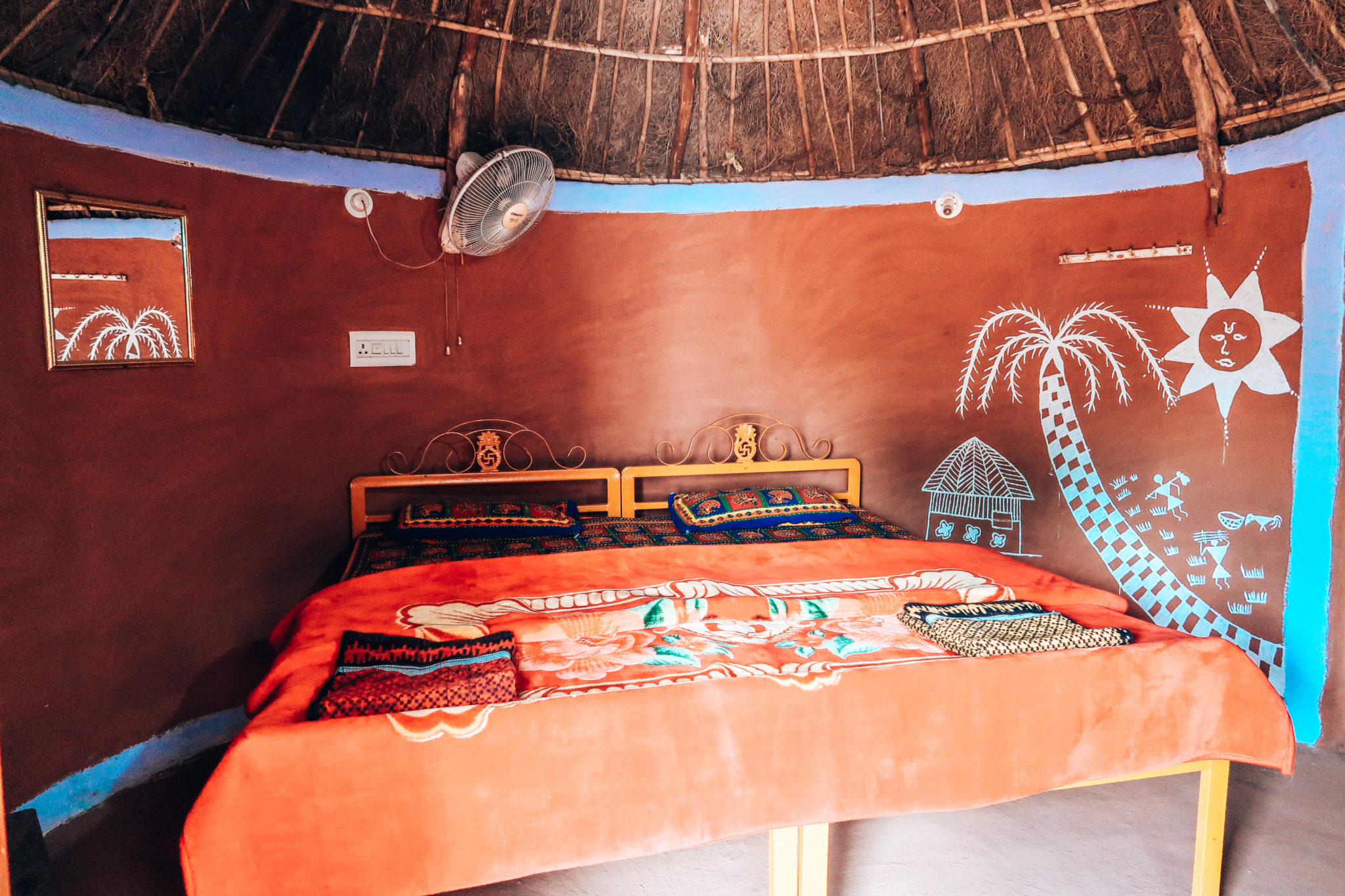 After being shown to our hut we drank Masala Chai and Chhotaram talked us through the plans for the next few days. There are six huts at the homestay which rather interestingly, are made from mud and cow dung – you can’t tell! The huts have been beautifully decorated, the bed was super comfy, they are warm and cosy with basic en-suite facilities and fans to keep you cool in the evening.